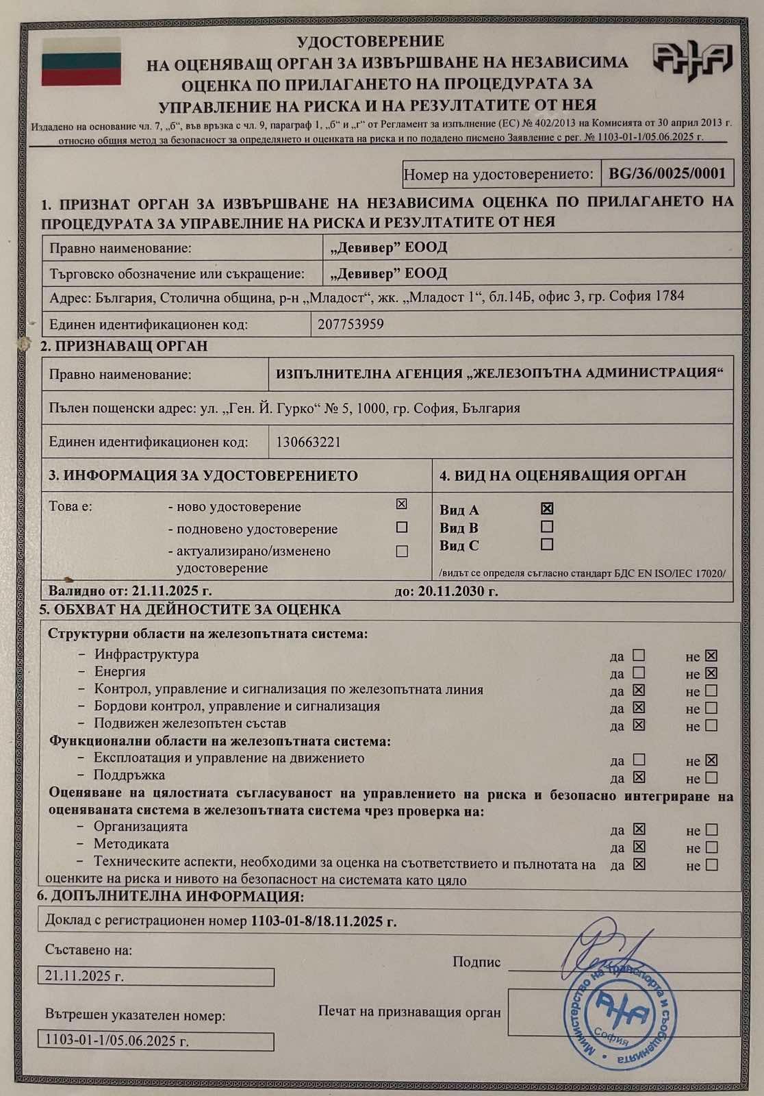 Deviver is recognized in alignment with Directive (EU) 2016/798 on railway safety by the Railway Administration Executive Agency to conduct safety evaluations and assessments for railway products, processes, services, and installations: